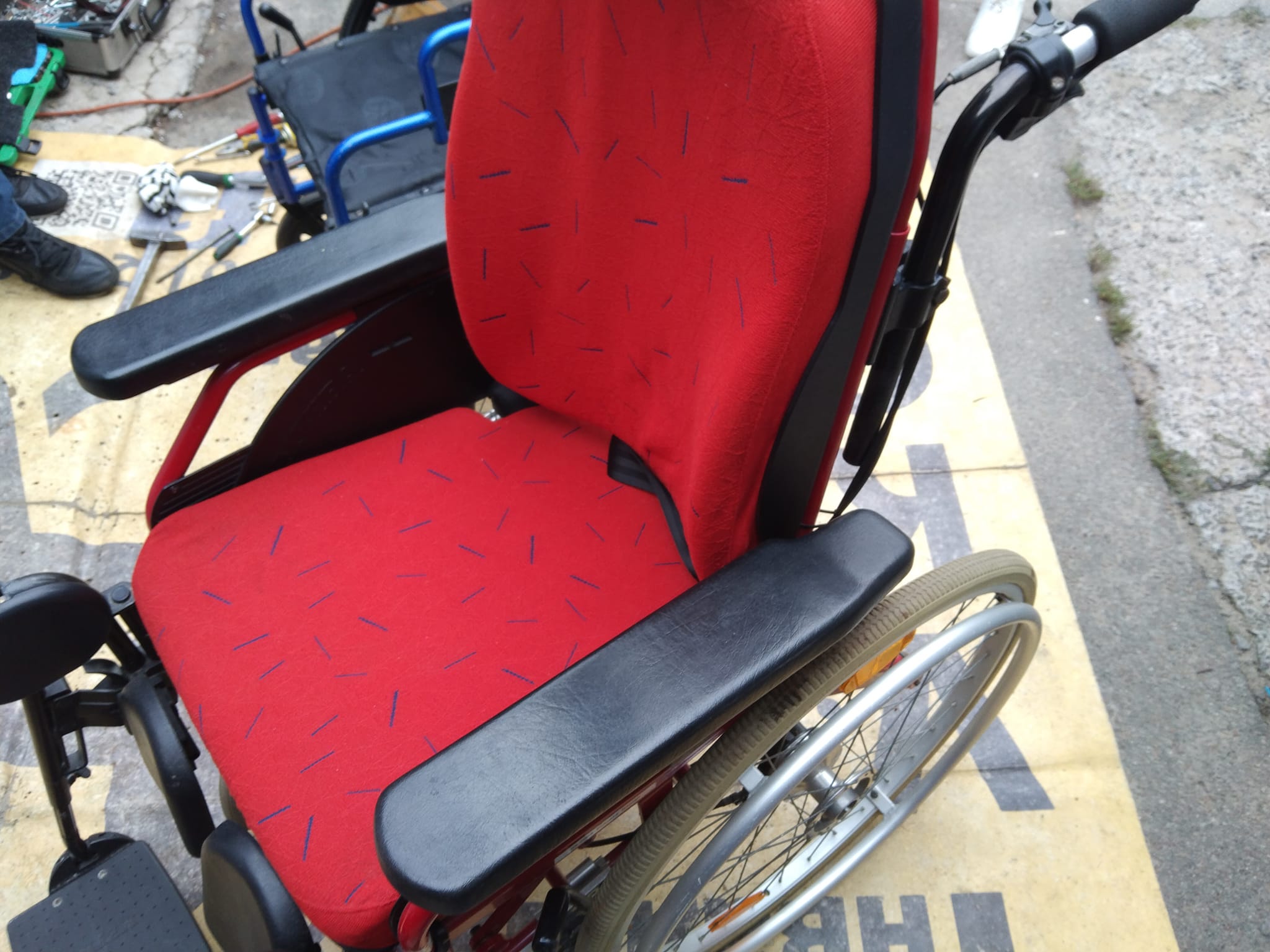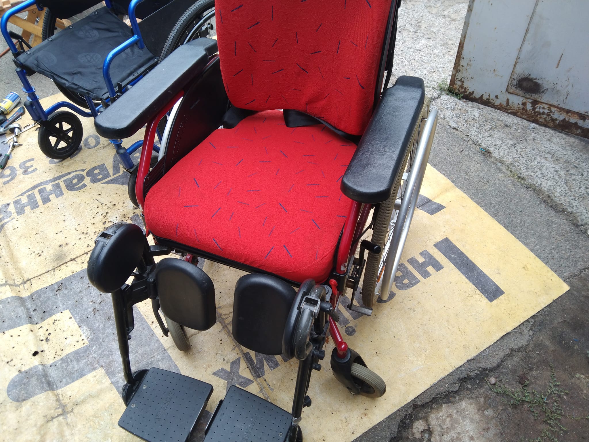 Відремонтували хрестовину рами, замінено підшипник переднього колеса, відрегулювали стояночні гальма і замінили підлокітники. І провели повне обслуговування візка.