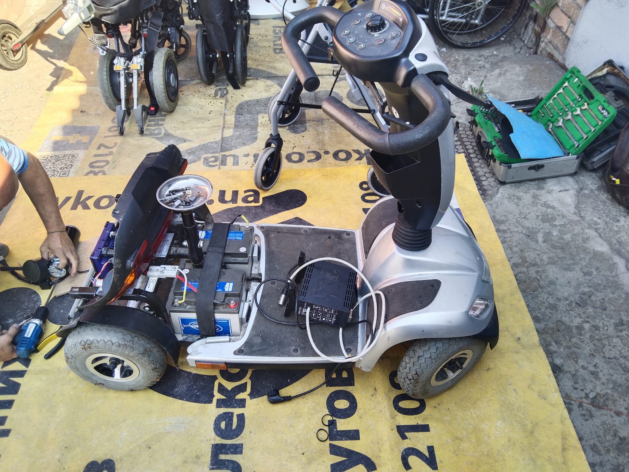 Також привезли скутер для людей з інвалідністю і похилого віку на діагностику і ремонт. Як завжди треба розібратися що до нас ремонтували. Запустили.